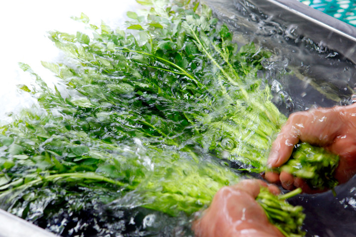 2. 물에 담갔던 미나리를 물에 씻습니다.