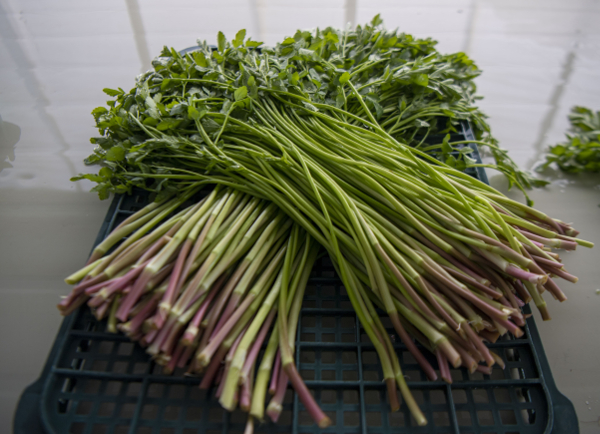4. 미나리가 너무 크면 머리 부분과 줄기 부분을 갈라 씻어낸 후 다시 물에 씻어줍니다.
